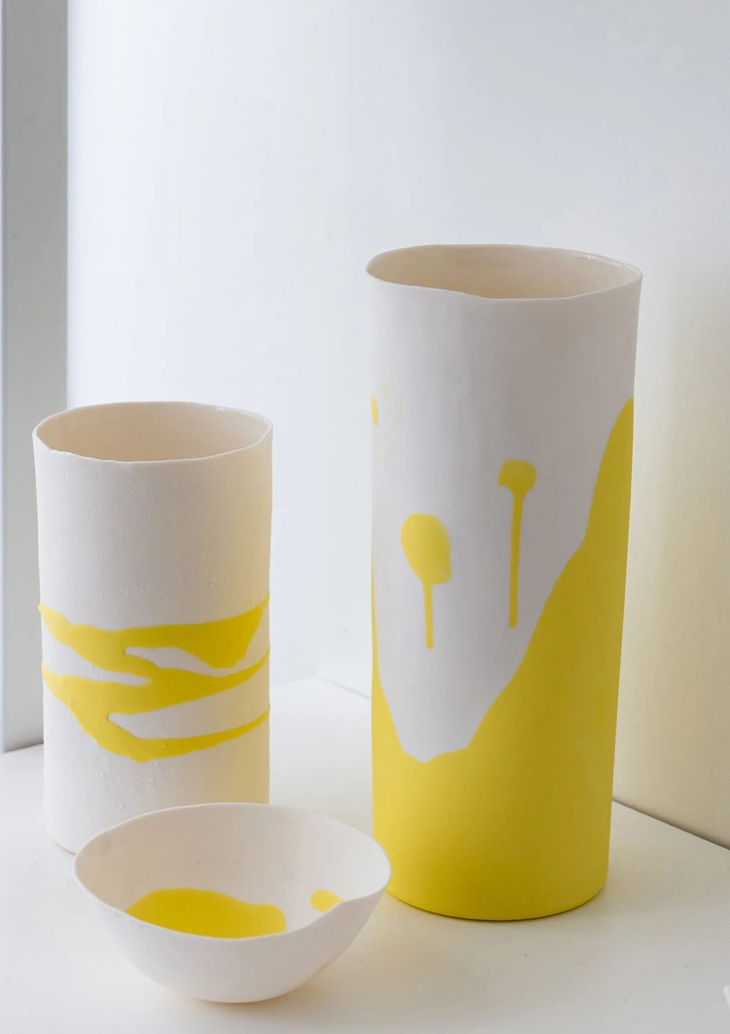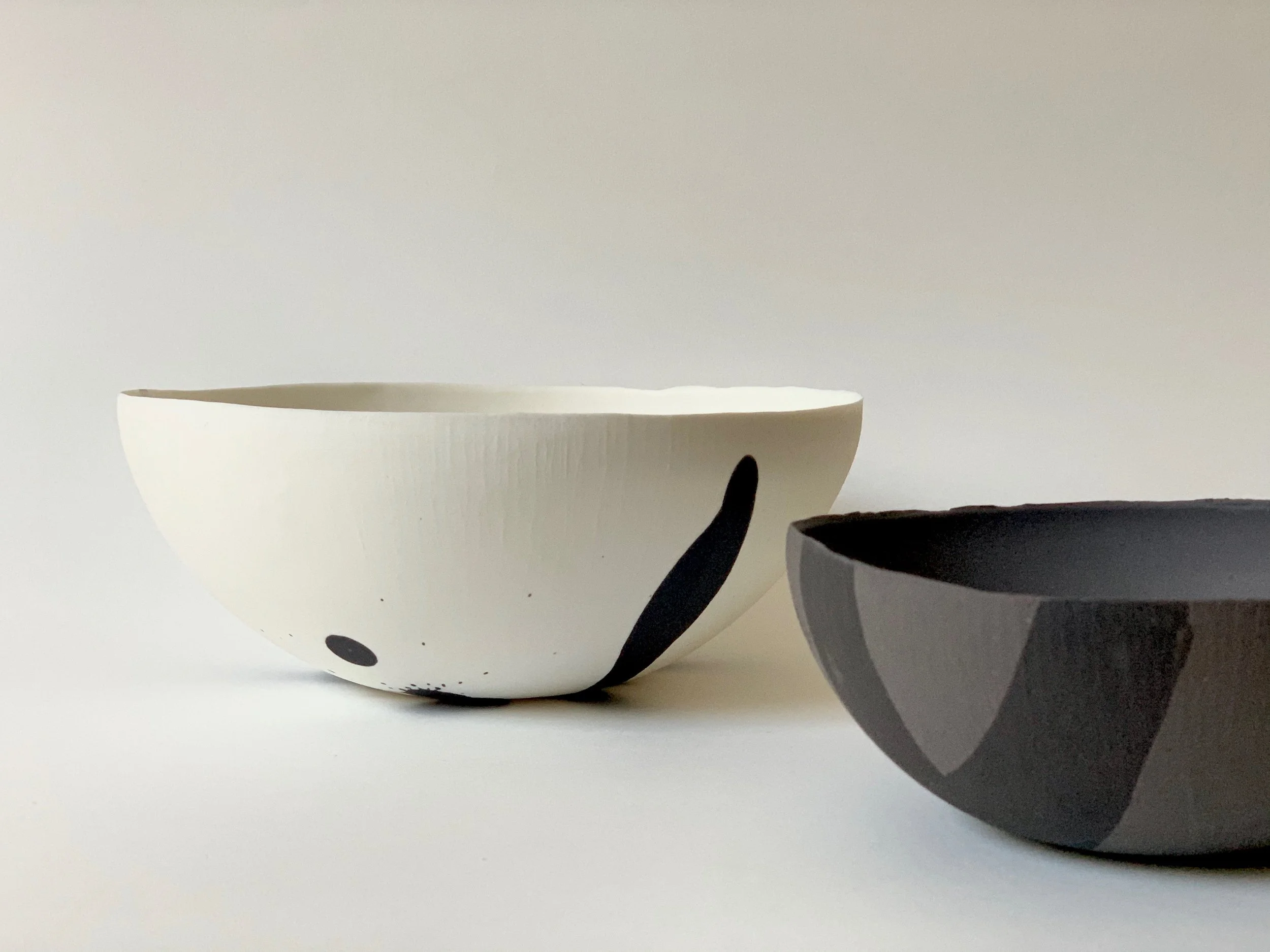 Oxyde, engobe, émaux mats, brillants ou satinés, en blanc, noir ou avec des touches dorées… autant de possibilités pour imaginer des dessins graphiques ou abstraits.