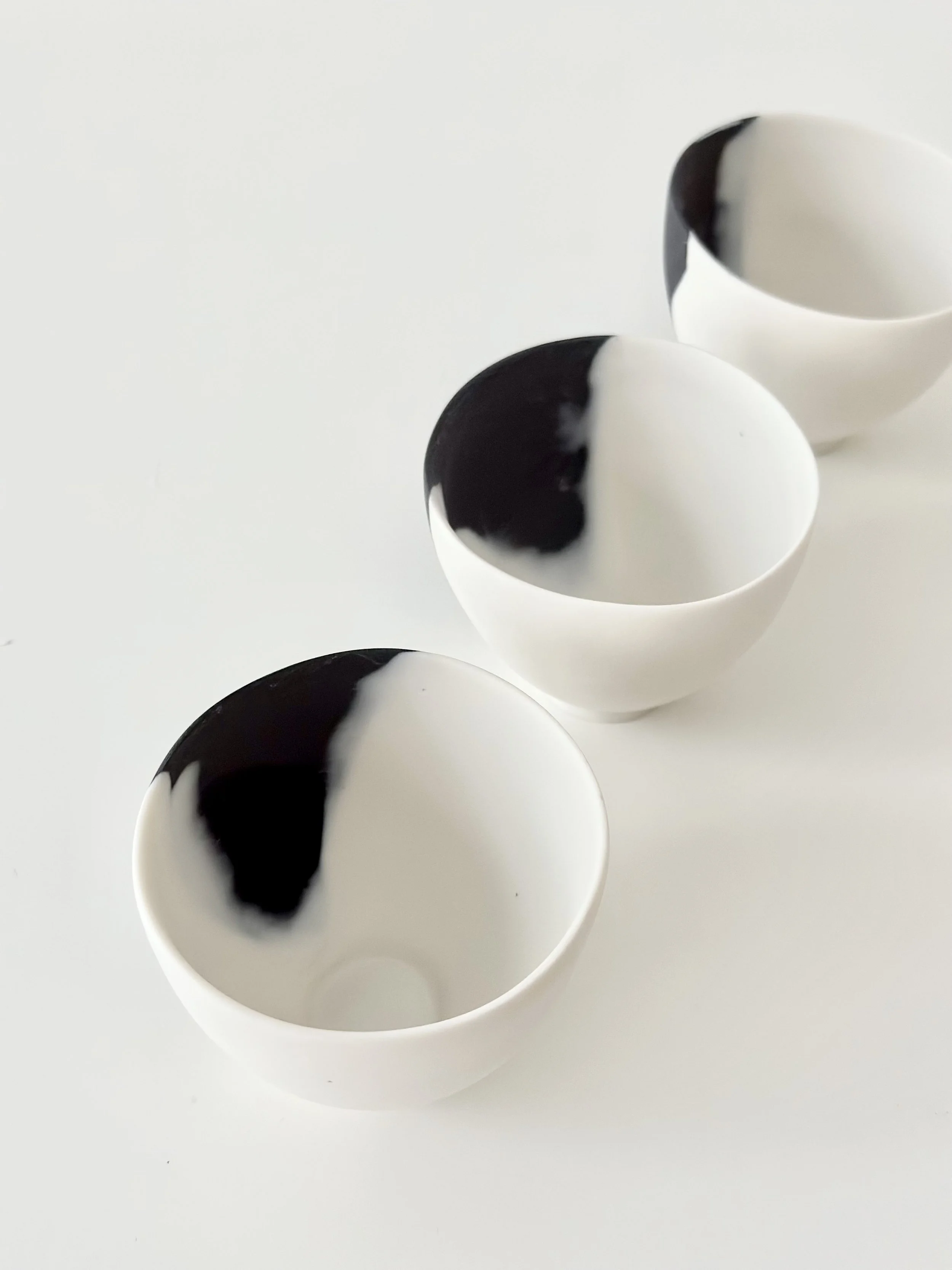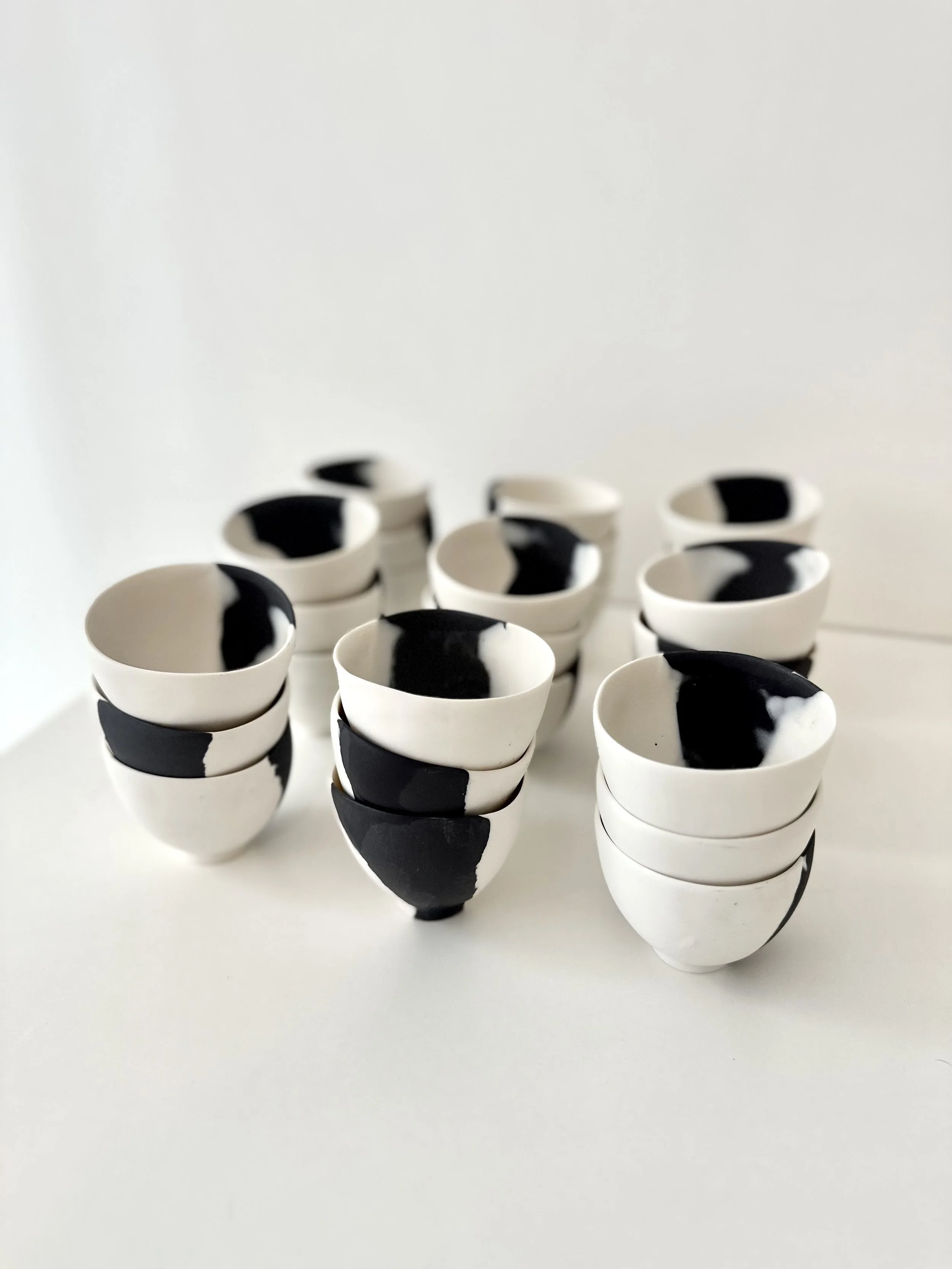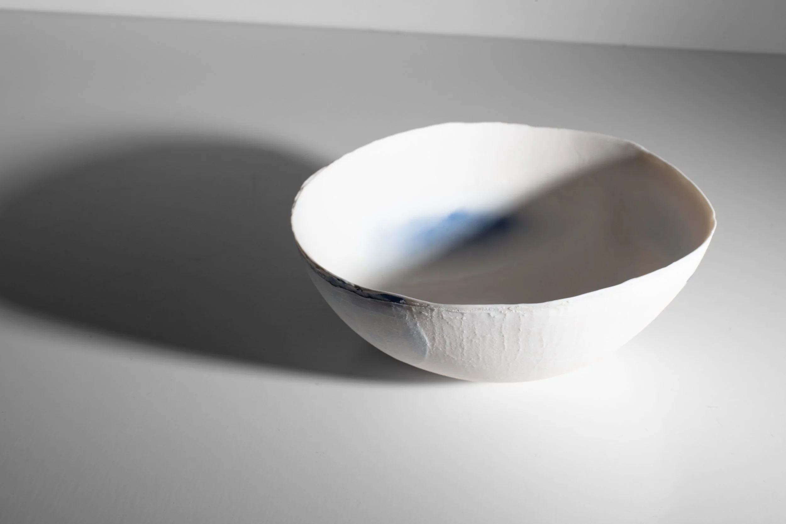 Chaque pièce naît de l’association de terres : la porcelaine blanche dialogue avec une couleur, mêlée ou assemblée de différentes façons.