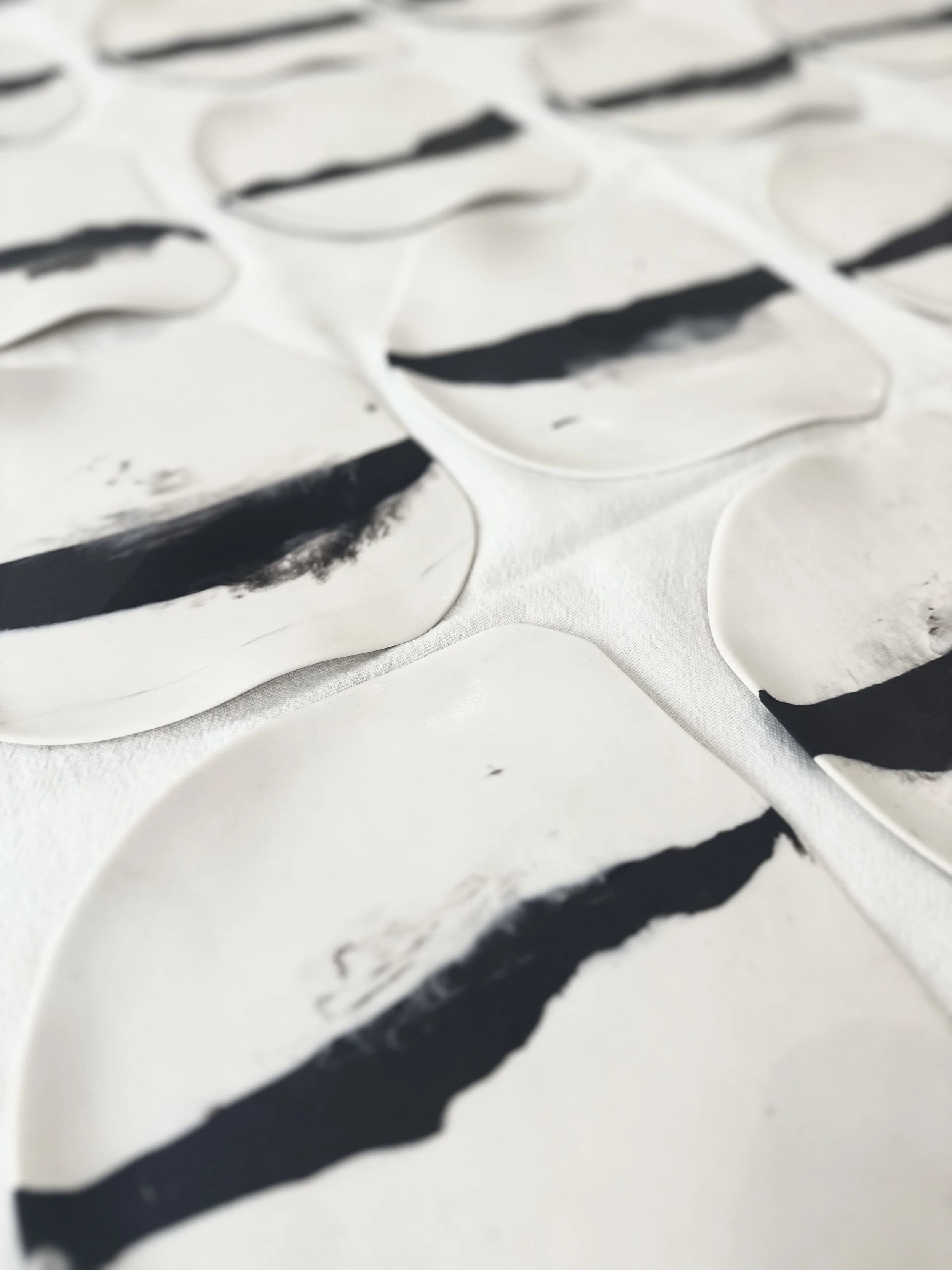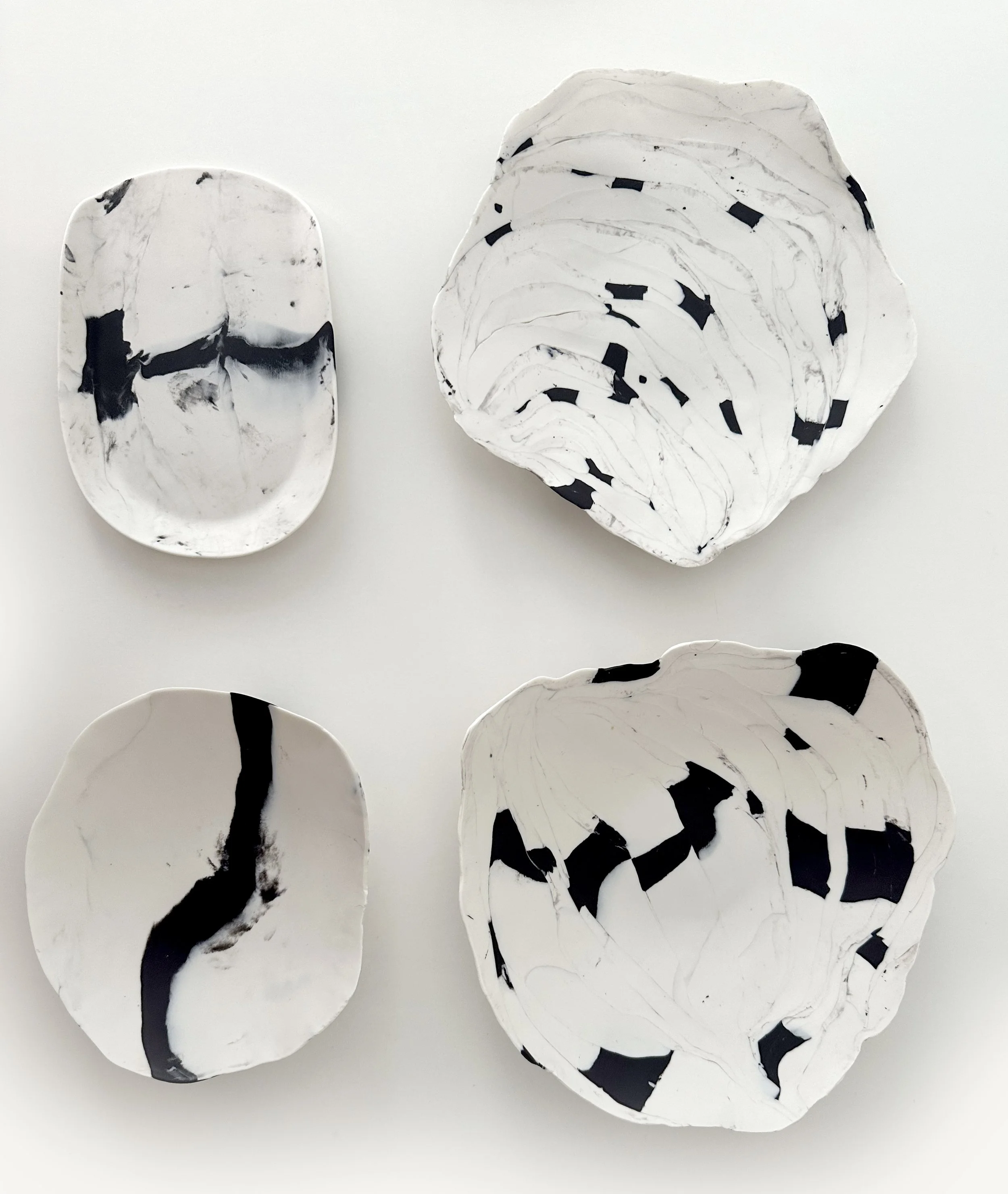 Assiettes, bols ou plats : la collection Collage se situe à mi-chemin entre tradition et création contemporaine, inspirée des techniques de la terre mêlée et du Nerikomi, revisitées de manière personnelle.